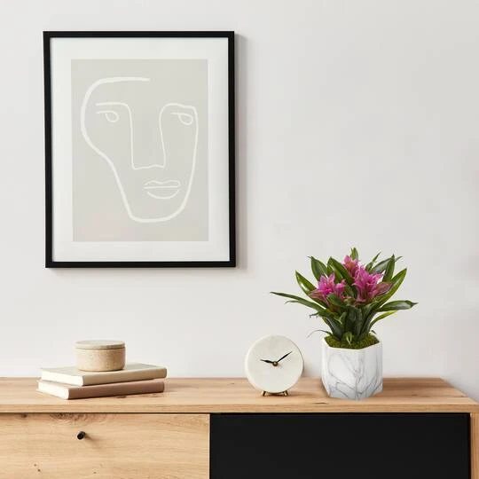Bright colors can often rejuvenate an otherwise dull room. With passionate bright blooms that accent and sit nestled with in its green foliage, the artificial bromeliad plant that comes in a marble vase will do just that: stimulate and add energy to your living space. Use this brilliant ornament as a centerpiece on your formal dining room table.