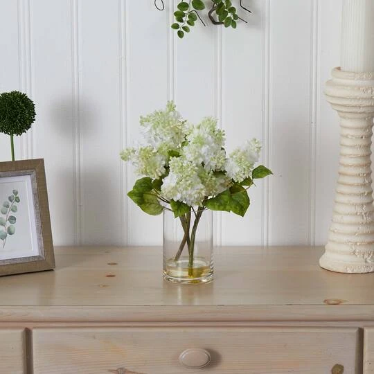Do you like Lilacs? If so, this superb arrangement is right in your wheelhouse. Several strong Lilac stems rest in a beautiful cylinder vase complete with faux water, and rise to give way to an explosion of soft color. The various shades of white and green create a warm feeling that will cut through even the chilliest of days.