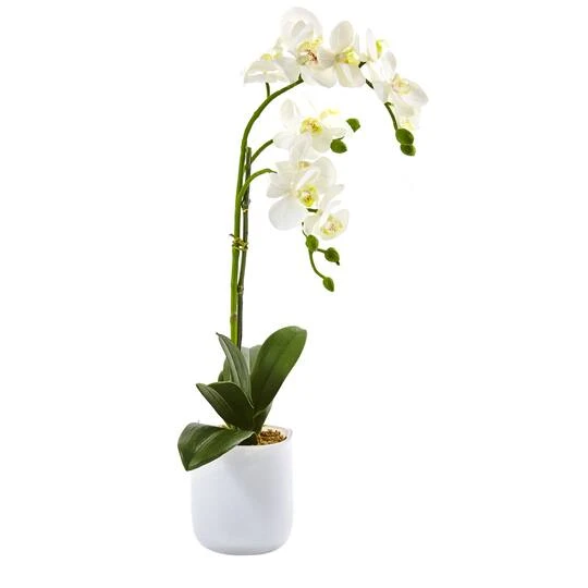 Elegant in crisp white, orchid petals blossom in a bundle with this Phalaenopsis arrangement. Petals cascade against rich green stems for the perfect side-table accent. Place in the bathroom for a timeless, clean look. Includes frosted glass planter.