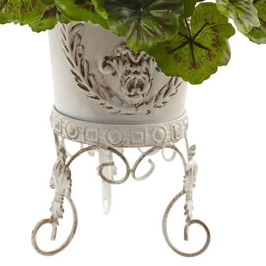 Vivacious cleft flowers give this Geranium arrangement a burst of color. Rounded green and brown rimmed leaves are handcrafted with authentic detail. The distressed metal white planter gives the arrangement an antique look. Place this accent by a fireplace or patio to complete your enchanting living space.