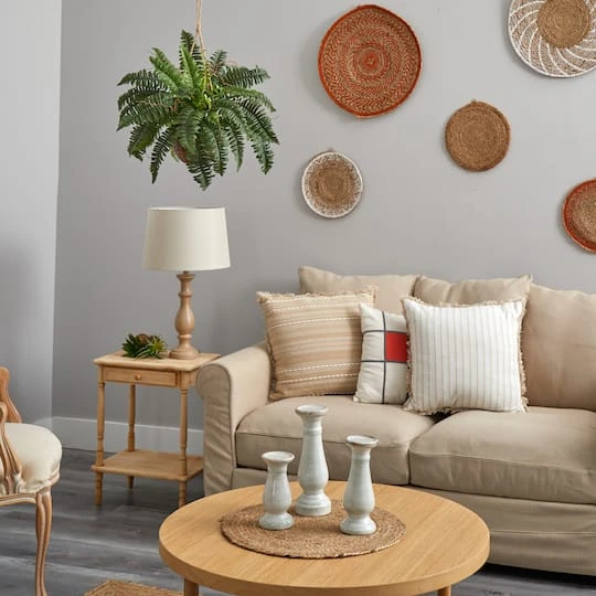 Travel back in time with this elegantly styled Boston fern silk hanging basket. Reminiscent of Victorian days, this native of the tropics has been a favorite throughout the years. A perfect complement to your home, this leafy creation is covered from head to toe with lush natural looking fronds. The expertly crafted alternate leaf pattern adds further to its authentic appeal. Nestled snuggly in a wicker basket, this impressive plant will provide you with years of carefree pleasure.
