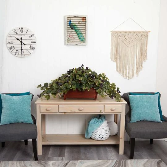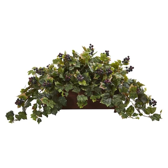 Small purple grape accents are interspersed among green leaves on this artificial grape plant. Situated in a beautiful planter, this plant is 18 inches in height and will inject a natural, calm feeling in your kitchen space. Position it as a centerpiece on your kitchen island with a decorative brown bowl holding faux fruit and a tray filled with kitchen utensils.