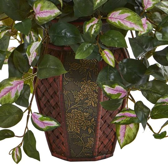 This 20″ artificial hoya plant features bountiful amounts of variegated pink and green leaves that spill elegantly over the included decorative planter. Add a natural touch to your kitchen island or bar by combining this realistic piece with other potted artificial flowering plants or fruits. You can also place this piece alongside your essential bowls and pots for a complete look.