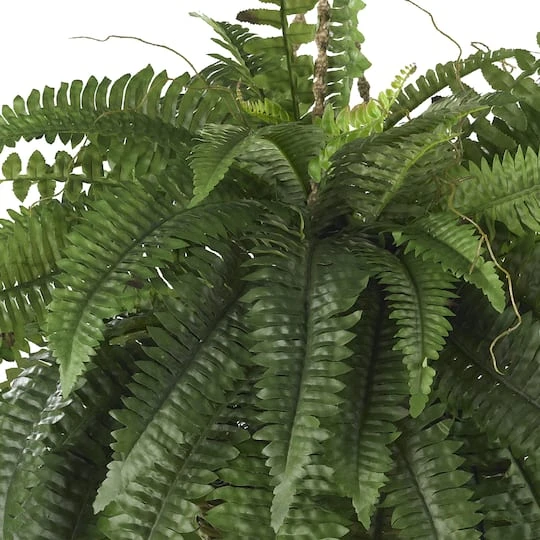The Boston fern is one of nature’s best-loved ferns. The reasons are obvious: it’s big, billowy, has pretty stems and the leaves reach out and dip downward in a pleasing effect. This large Boston fern hanging basket perfectly personifies everything we love about this plant, with the bonus of never needing water or sun.