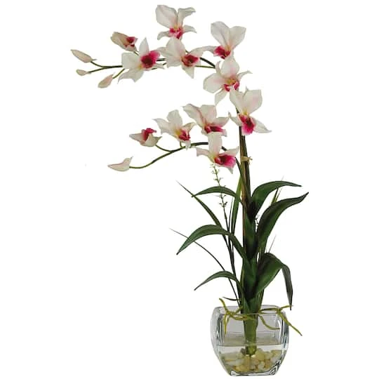 Arching gracefully over natural stems and lifelike leaves, our orchid arrangement would be an elegant addition to any home or office décor. The whimsical orchid blooms skip along twining stems and create a gentle, refined design statement. A liquid illusion-filled glass vase perfectly finishes this beautiful arrangement, accented with river rocks and bamboo.