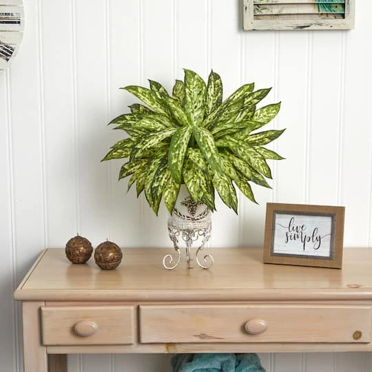 The leaves are the focal point of this plant. Each leave is a light green with dark green tips and natural white specks that mimic a true aglaonema plant. The curvature of the leaves come together to create a lush look. Comes in a distressed, white metal planter to highlight the specks on each leaf.