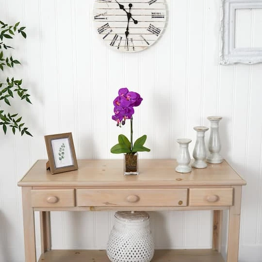 Settled within a clear vase, the 24 inch artificial moth orchid arrangement features soft flowers and realistic foliage that sits at the base of the stem. Simplistic and elegant in design, this décor piece will brighten up and add a splash of color when positioned on a kitchen counter next to your coffee maker or a bathroom counter near the mirror.