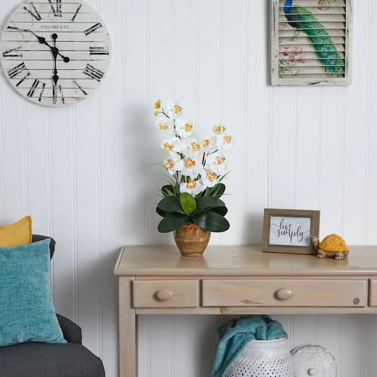 This 25 inch double stem Phalaenopsis silk orchid plant is nothing short of an explosion of color. Expertly arranged, this piece was designed to enhance any space. Each plant comes stacked with two amazing Phalaenopsis stems each with 6 flowers and 2 buds. Finished with a gorgeous glazed ceramic vase this item is not to be missed. Shows natural looking exposed roots and are well designed and constructed to be life-like in appearance.