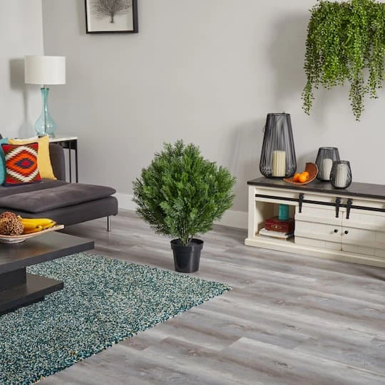 Adorned with intricate stems, this lush cedar bush is the perfect background foliage for a fireplace floor arrangement or mudroom accent piece. Lifelike, detailed cedar leaves are arranged with adjustable stems. Place with holiday accessories or springtime figurines for year-round seasonal décor. Bush comes with round, black plastic pot.