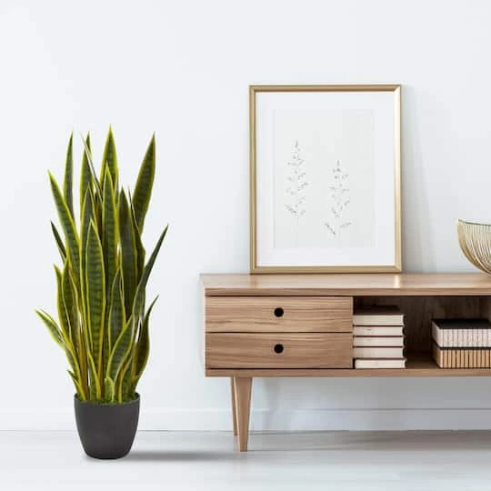 The sansevieria artificial plant, sometimes referred to as snake plant, is a fun gathering of straight-edged leaves that appear to be growing right out of the dirt. With dark green stripes accenting each leaf, this is a unique and eye-catching piece.