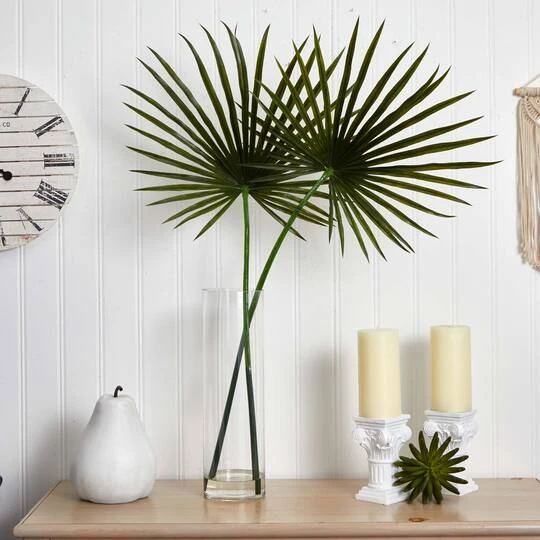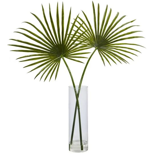 Simple, yet stately, two palm leaves fan apart to offer tropical greenery year round. Place on the mantel for added height or atop a hall table to greet guests. Constructed with fine quality material, the palm leaves stand together in a 49″ tall arrangement. Includes glass cylinder vase.