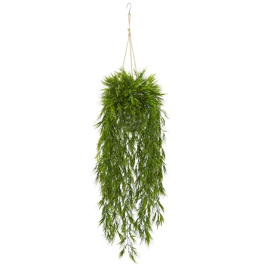 Maximize your vertical space with this Mini Bamboo Plant in Metal Hanging Planter. It boasts a wild and unruly overgrowth of thin-bladed leaves cascading down like an evergreen waterfall. Adding texture and dimension wherever displayed, this mini bamboo plant reaches 4ft. long from a hanging metal bucket. Requires absolutely no maintenance or upkeep. Measurements are from the bottom of the pot to the furthest extended leaf or branch.