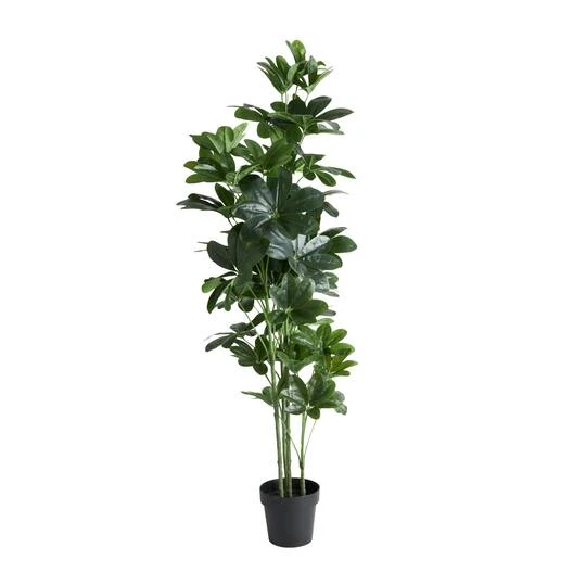 This artificial floor plant is made from a combination of plastic, iron, and cement materials to create a realistic design. It features green leaves and branches and is anchored in a matte black pot.