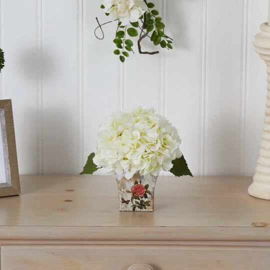 This compact yet beautiful Hydrangea arrangement is the ideal decorating accent when you don’t have a lot of room, but want a lot of impact. The colorful, billowing blooms that are the Hydrangea’s signature rest upon a base of greenery, all snugly nestled into a decorative floral planter. Perfect for both home and office, this arrangement never needs water, and makes a thoughtful gift too.
